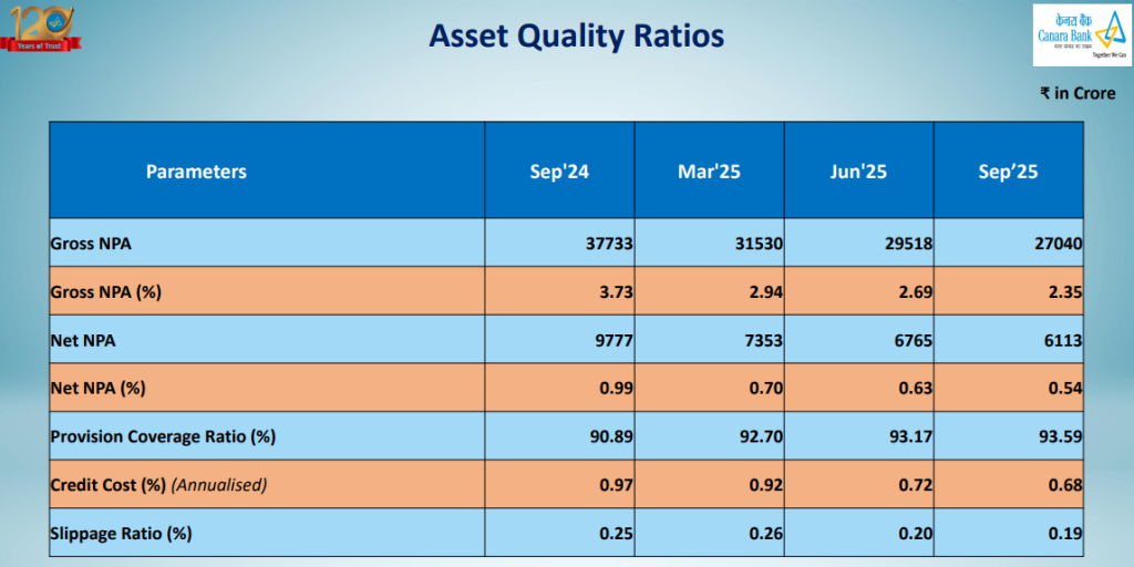 The most compelling aspect of Canara Bank’s Q2 performance lies in asset quality improvement. Gross NPA ratio declined 138 basis points year-on-year to 2.35%, while Net NPA ratio compressed to 0.54% from 0.99%.